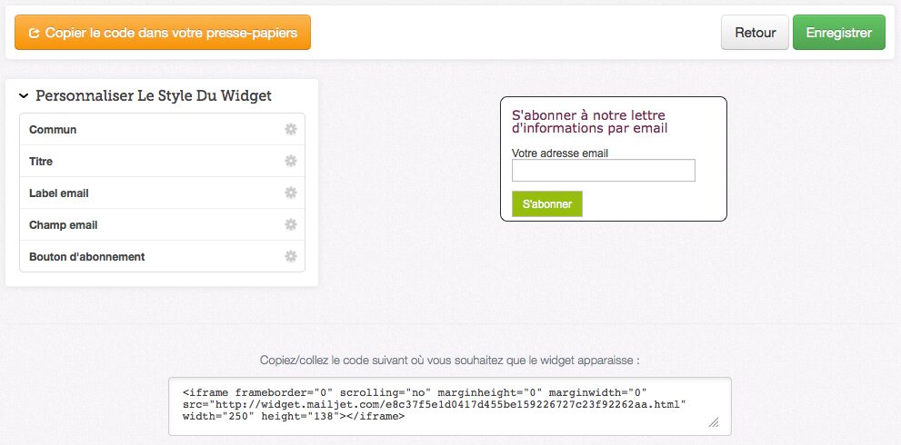 L’intérêt de Mailjet réside aussi dans son widget que vous allez pouvoir implanter dans votre site. Les visiteurs pourront ainsi s’inscrire à votre liste de contacts directement à partir de votre site. Vous n’aurez pas à les ajouter à la main sur la plateforme.