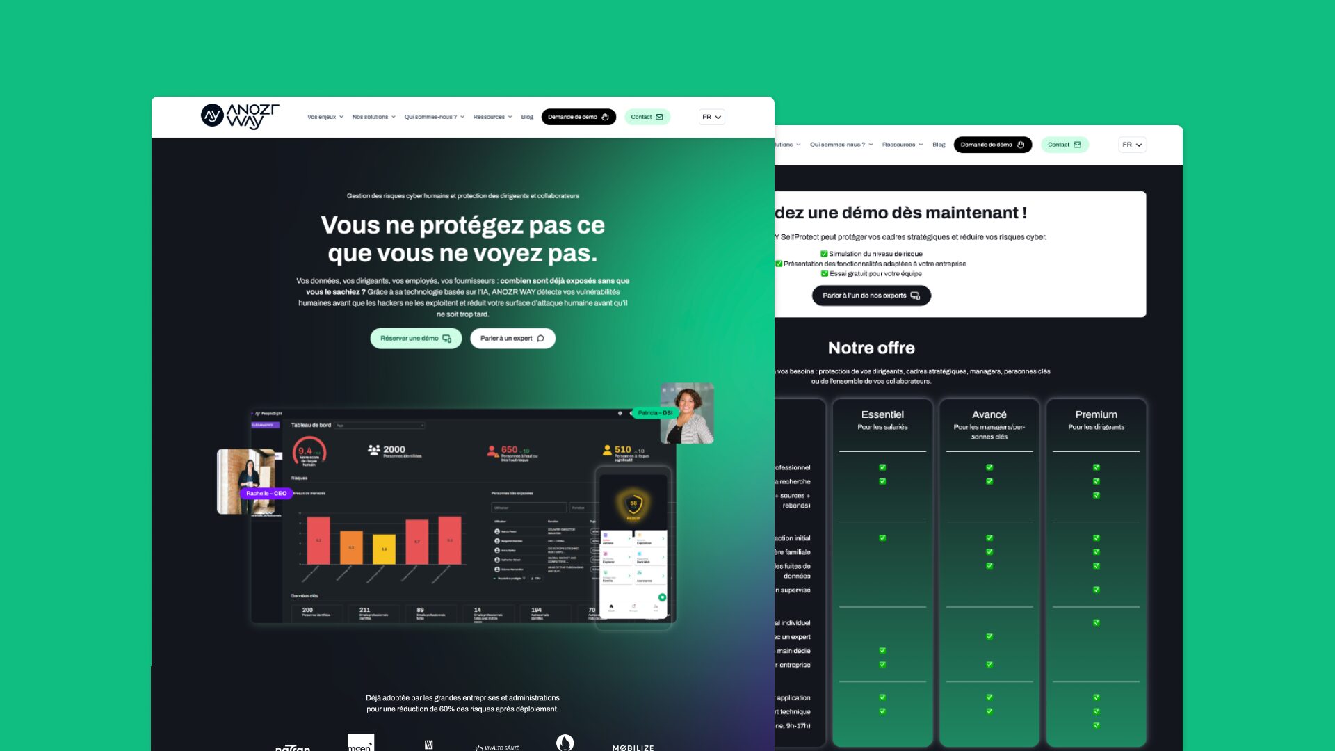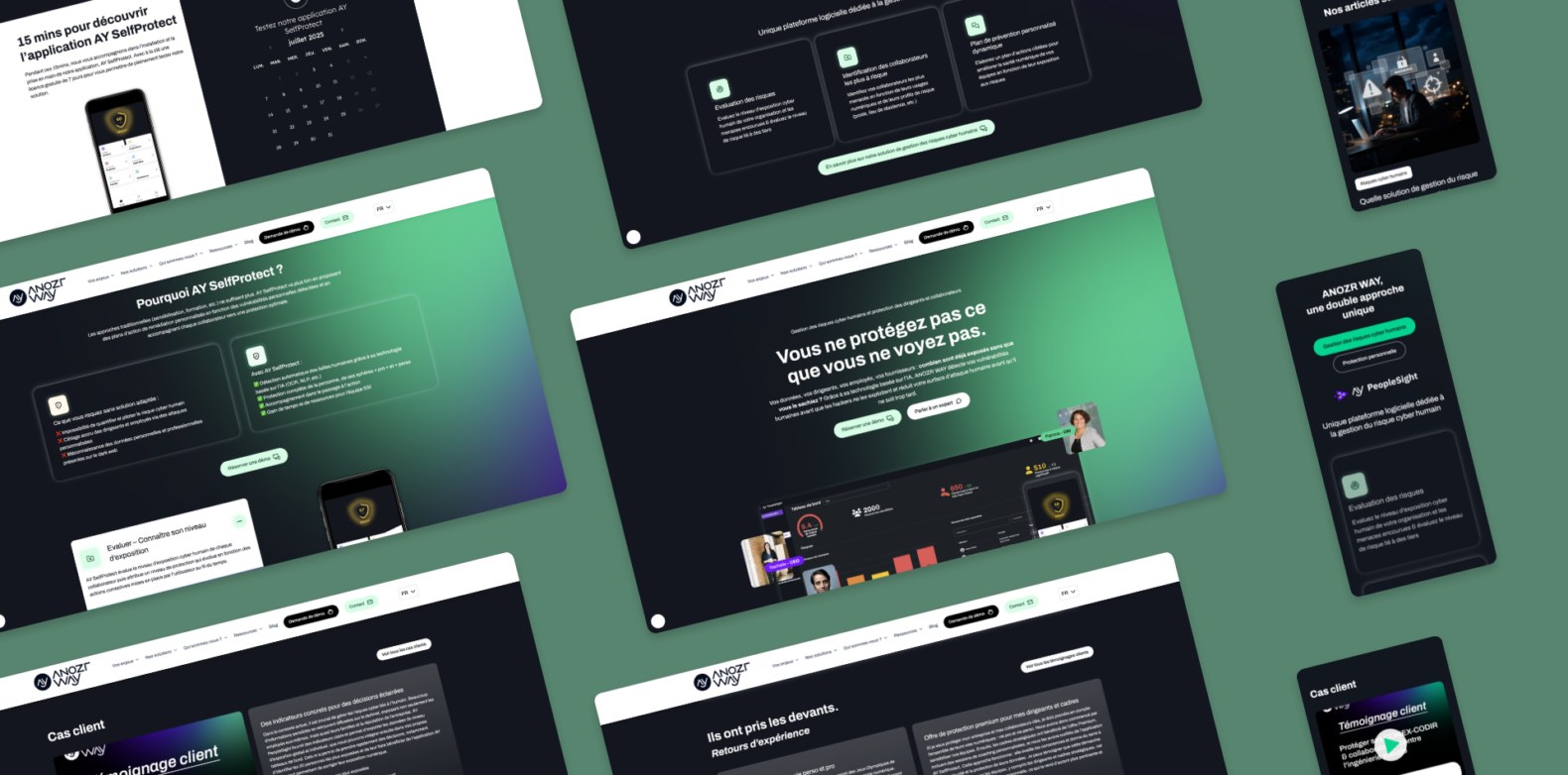 Le design a été pensé pour offrir une navigation intuitive et sobre, répondant aux standards de confiance du secteur, et simplifier les parcours dans le but de guider l’utilisateur en quelques clics vers les pages clés (solutions, cas d’usage, contact). La direction artistique vient renforcer cette expérience en reflétant l’ADN d’ANOZR WAY : une approche claire, directe et rassurante, qui met en lumière la gravité des enjeux tout en instaurant un climat de confiance.