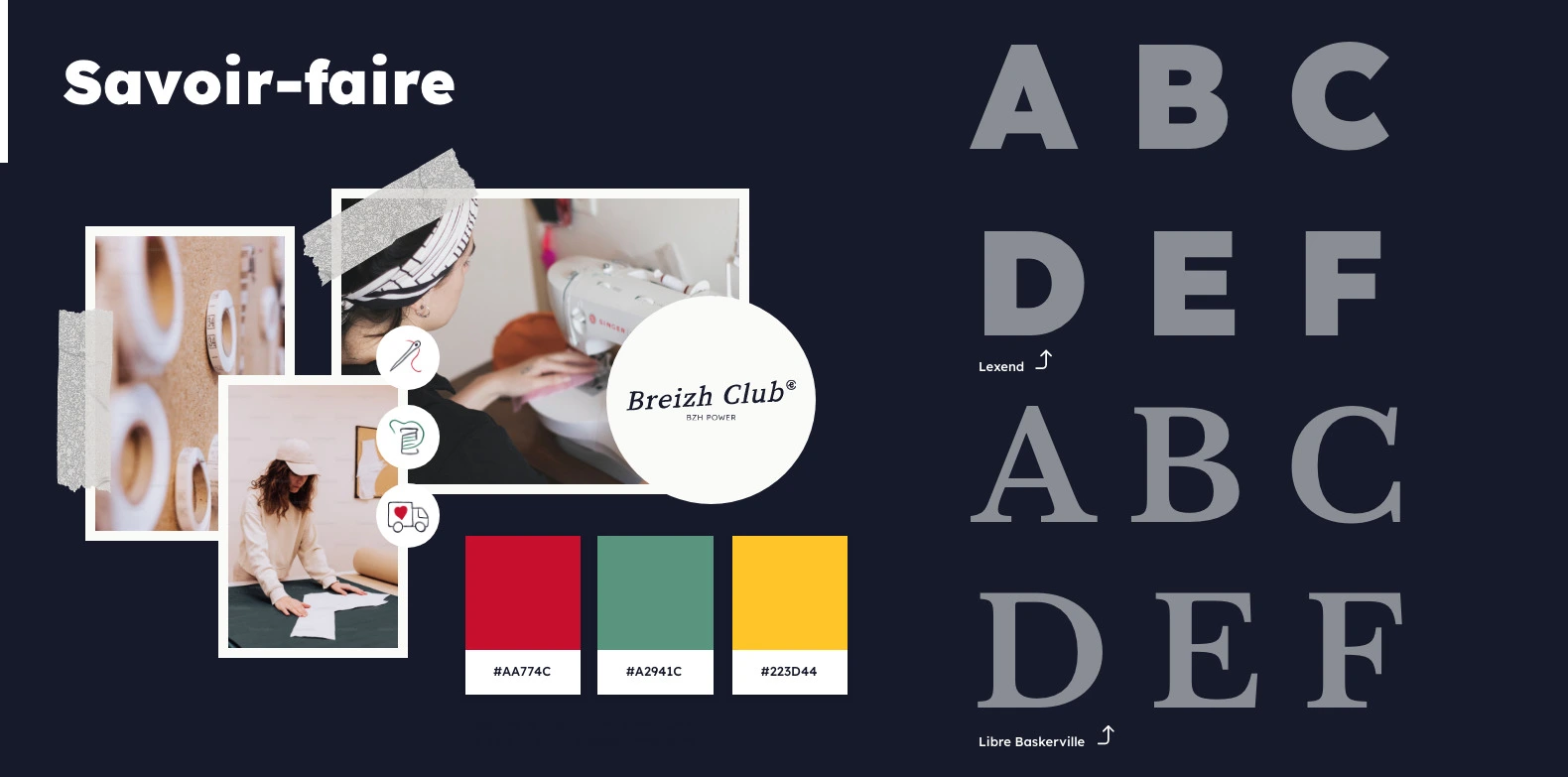 - Palette savoir-Faire : En reflet du caractère haut de gamme de Breizh Club, elle utilise un bleu sombre pour souligner l’élégance de la marque, complété par des touches de rouge, de vert et de jaune, judicieusement intégrées pour enrichir l’iconographie.