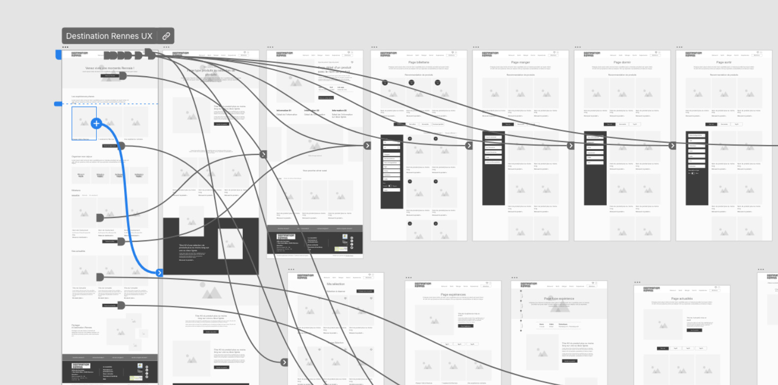 Pour concevoir une expérience utilisateur immersive pour le site de tourisme de Rennes, nous avons entrepris une analyse exhaustive des parcours utilisateurs et des interconnexions entre les pages. Cette étude approfondie a permis de visualiser de manière macro les différents parcours que les utilisateurs pourraient emprunter. Cela nous a conduit à redéfinir et à optimiser l’arborescence du site, garantissant ainsi une navigation fluide et intuitive.