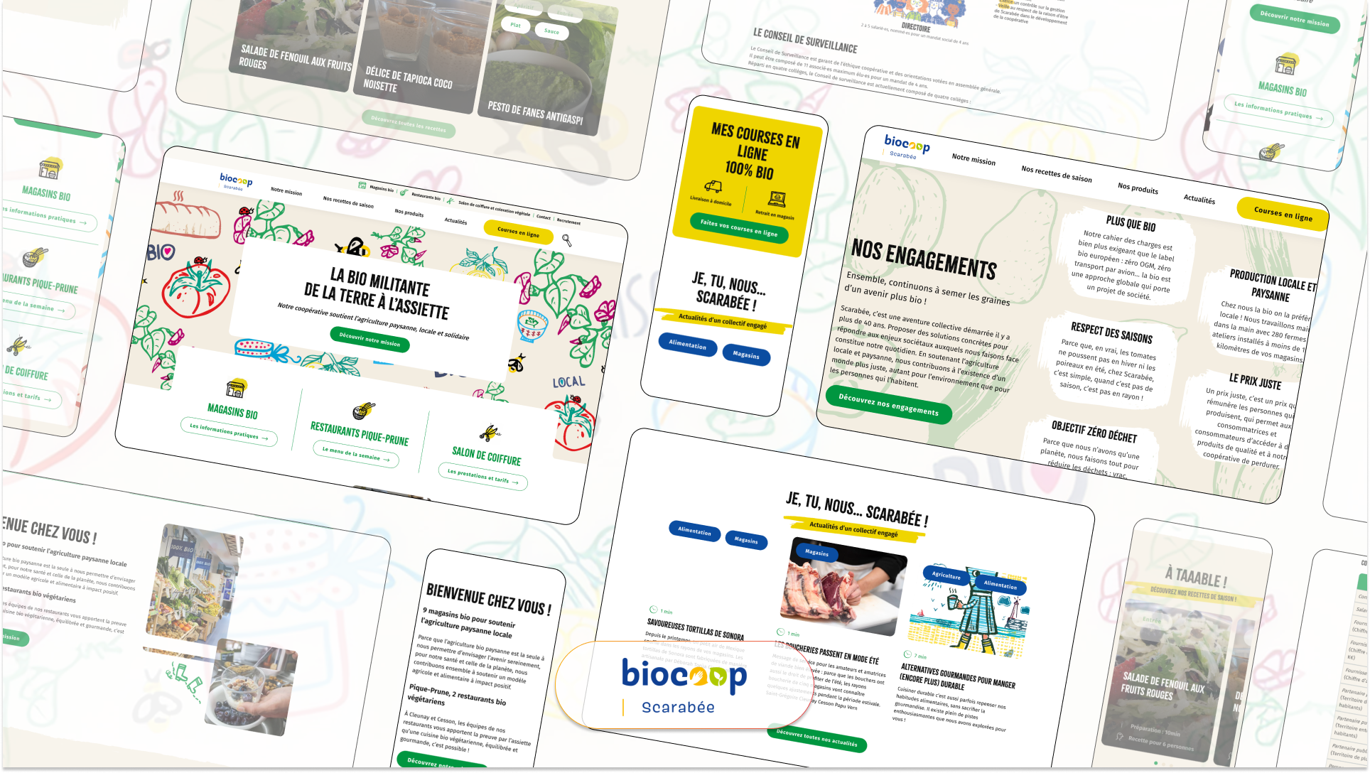 Nous avons animé des ateliers collaboratifs pour cerner les objectifs de Scarabée Biocoop et les attentes de sa clientèle. Ensemble, nous avons conçu un parcours utilisateur fluide, aligné avec l’identité locale et coopérative, facilitant l’accès aux informations et mettant en avant l’indépendance de la marque.