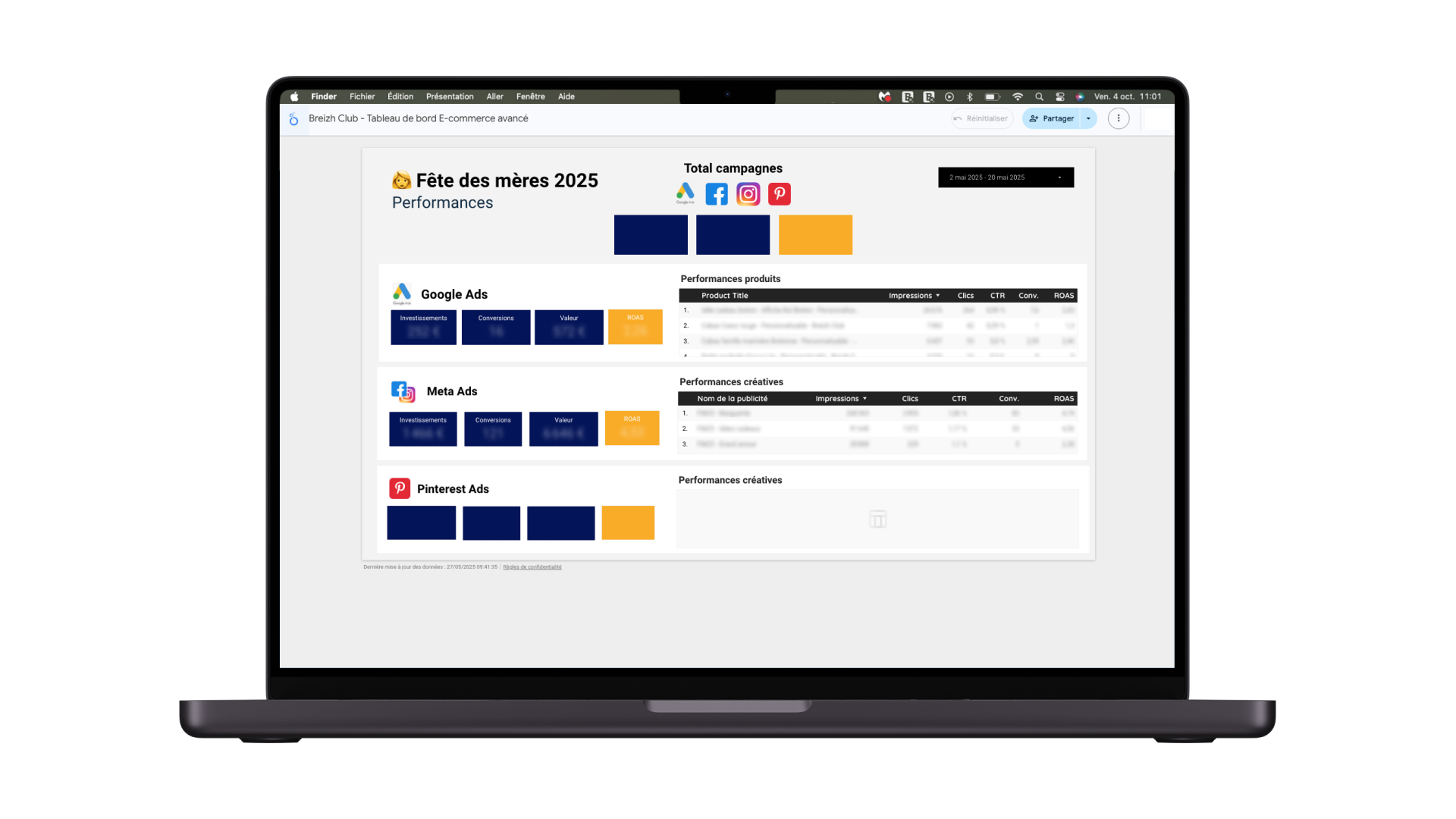 - Le suivi des campagnes publicitaires multicanales (Google Ads, Meta Ads, Pinterest Ads), avec un focus sur les temps forts comme la Fête des Mères → pour mesurer précisément la performance par levier de chaque campagne, piloter les budgets d’acquisition, et améliorer le ROI marketing sur le long terme.